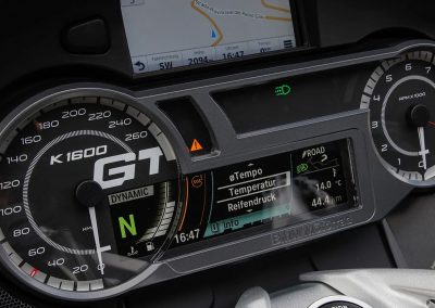 Dinamismo y confort, estas características de la K 1600 GT también se reflejan en el diseño. La suspensión delantera Duolever, el faro de xenón con luces autoadaptables, el potente motor de 6 cilindros y el cuadro hacen que el exclusivo conjunto destaque especialmente.